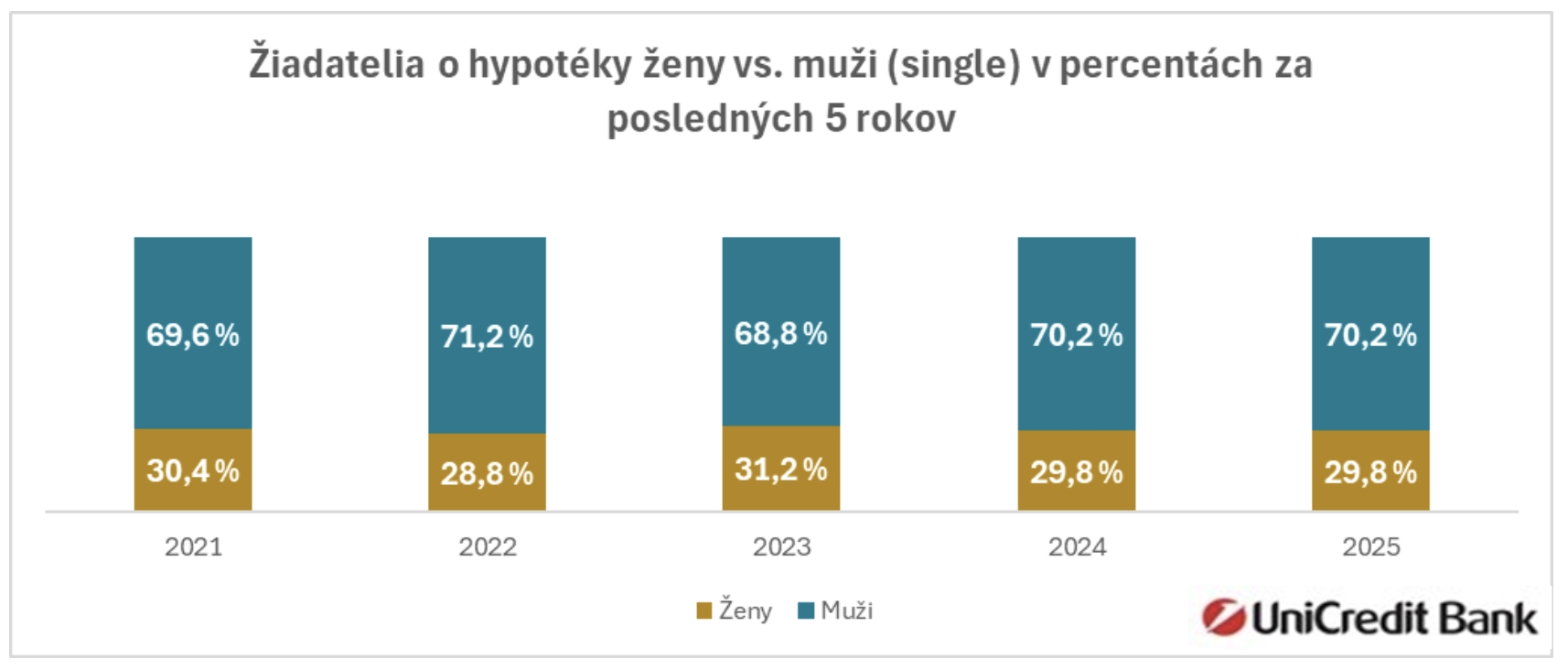 „Rozdiely sú najvýraznejšie práve u klientov, ktorí žiadajú o hypotéku samostatne. Muži na Slovensku do samostatnej hypotéky vstupujú podstatne častejšie a podiel žien samožiadateliek je oproti nim tretinový,“ hovorí Zuzana Ďuďáková, hovorkyňa UniCredit Bank.